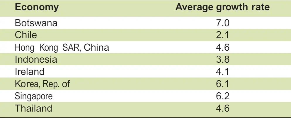 Annual growth in per capita income averaged 7.0 percent between 1966 and 1999 (table 4.1 and figure 4.1). The country’s performance is particularly impressive compared with that of other African economies (figure 4.2).