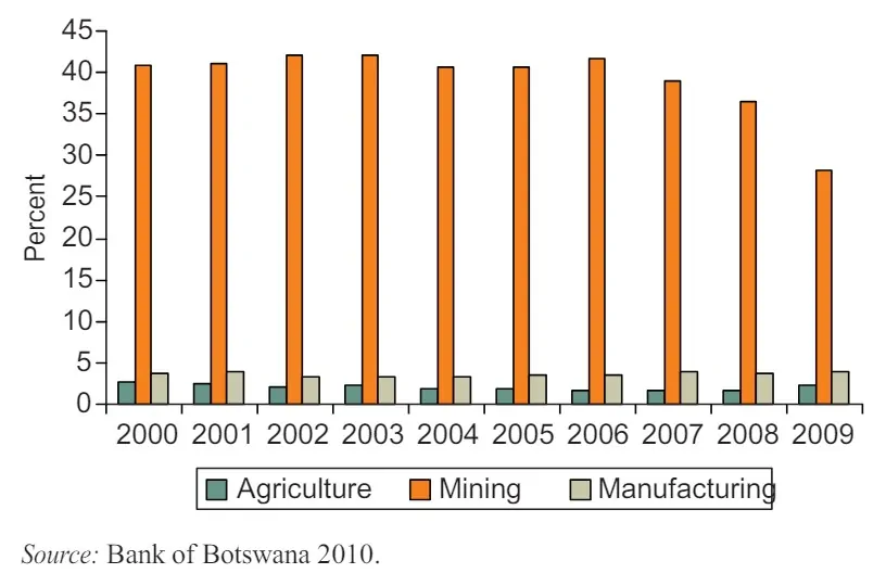 Figure 4.5: Contributions of Mining, Manufacturing, and Agriculture to Botswana’s GDP, 2000–09
